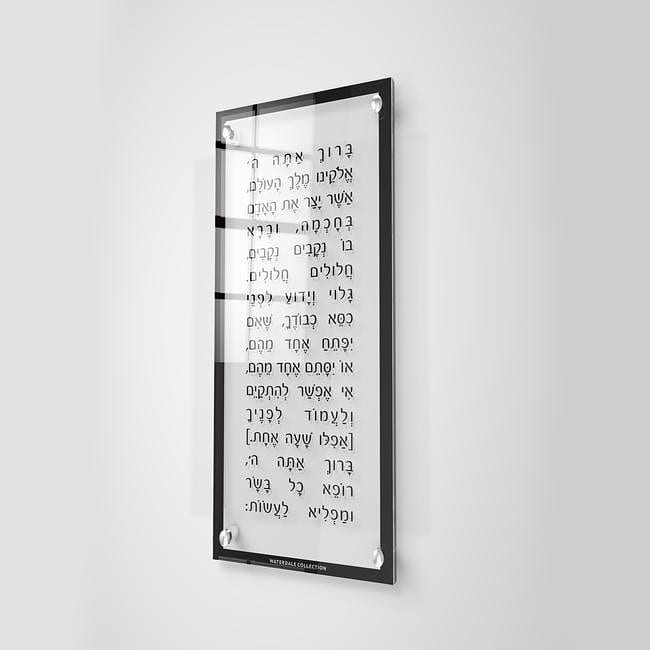 We love design. We love lucite. Our exclusive Waterdale Judaic Lucite brand began as a personal home decor project. As a designer, I always loved lucite. Lucite has rich qualities of crystal clear, more versatile than glass, and blends seamlessly into decor. After completing lucite plaques for large events, I thought - ''Why not bring the modern beauty of lucite and timeless Judaica to my home!'' Much personal planning went into the design of our first two Floating Lucite Judaic Arts, our original Floating Lucite (Acrylic) Asher Yatzar & Lucite Al Hamichya. The content, design, quality and functionality was hemmed and hawed on. Then it went up. After receiving comment after comment on my newest Lucite addition to my home, then begging and pleading of, ''Can you please make me one like that,'' our brand, Waterdale Lucite Collection was born. Judaic art has always been synonymous with heavy, traditional art. Waterdale Lucite set out to change that. Judaic art in Lucite keeps our traditional blessings we know, yet gives them a modern touch for every home. Moving on from our original two lucite arts, we developed more stunning lucite arts, each crystal clear, luxury thick, reflective polished edge lucites (acrylic), and frosted lucites for our more practical cards to make it beautiful, yet ever so practical and easy to use. Enjoy our Lucite Asher Yatzar, Lucite Al Hamichya, Lucite Benchers, Lucite Hadlokas Neiros, Lucite Birchas Habayis, Lucite Birchas Haesek, Lucite Eishes Chayil, Luicte Tabletop Al Hamichay, Lucite Hafrashas Challah, Lucite Modeh Ani, and Lucite Shema. We don't stop brainstorming and creating yet more uses for this ever so practical thing called Lucite. Join us on our decor project as we make every part of your home useful, practical, and yet timelessly beautiful. Lucite is a high quality, trademarked version of acrylic resin developed by DuPont in 1937. Acrylic plastics can be used as replacements for glass in many products, with varying degrees of visual and constructive qualities. Lucite is an acrylic plastic resin used primarily in fashionable interior and furniture design due to its strength, crystal transparency, and flexibility along with its resistance to UV rays, wind, and water.